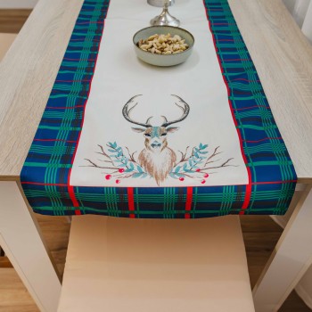 Stolnjak Joy veličine 45x140 cm dat će vašem domu jedinstvenu blagdansku atmosferu s daškom suptilne prirode. Stolnjak s elegantnim motivom jelena ističe se u kontrastu s plavo-zelenim kariranim obrubom. Ovaj božićni stolnjak izgleda elegantno, ugodno i skladno, idealno za postavljen stol tijekom zimskih blagdana. Izrađen je od izdržljivog i lako održavajućeg materijala koji zadržava oblik i boju nakon nekoliko pranja.