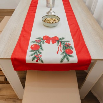 Ivon stolnjak dimenzija 45x140 elegantan je božićni dodatak koji će vaš stol pretvoriti u svečano mjesto puno topline i radosti. Bijela pozadina s motivom crvenih ukrasa, mašni i borovih iglica izgleda skladno i svježe, dok prepoznatljiv crveni obrub daje stolnjaku svečan izgled. Izrađen od izdržljivog i lako održavajućeg materijala koji zadržava svoje boje i oblik, idealan je za svakodnevnu i svečanu upotrebu tijekom Božića.